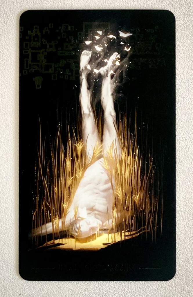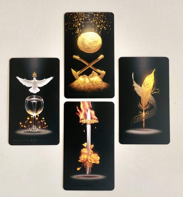 The cards themselves are stunning. Each card has it’s own beautifully designed photo on it and the cards are made of a very strong card stock. They are super thick (almost double the size of a standard tarot deck) and seem to be able to handle almost anything. I was a bit sad to discover that the cards themselves are not hand painted (that I can tell), only the edging is, however I am willing to overlook that. You can tell by holding them that a lot of thought and detail went into the meaning of each card. This is a stunning deck, however it can be a bit difficult to make out the words on the cards in certain light (i.e., name of the card). This is due to a beautiful laser etching done on the backs of all the cards, and the artwork for the Major Arcana, as well as the titles and names of each card.