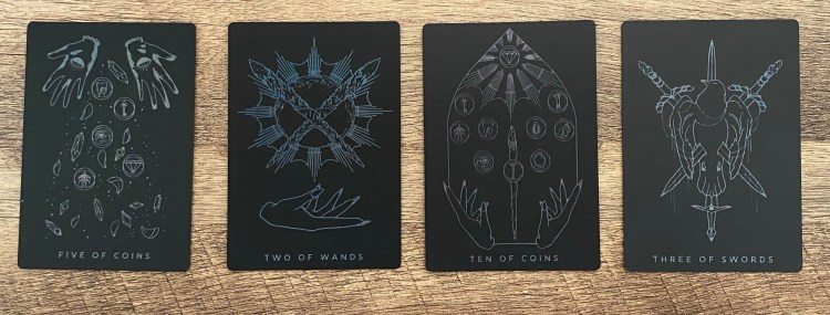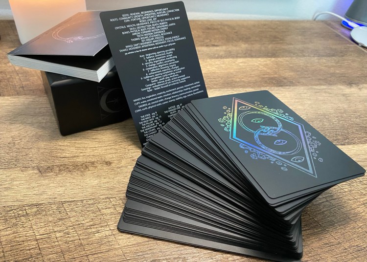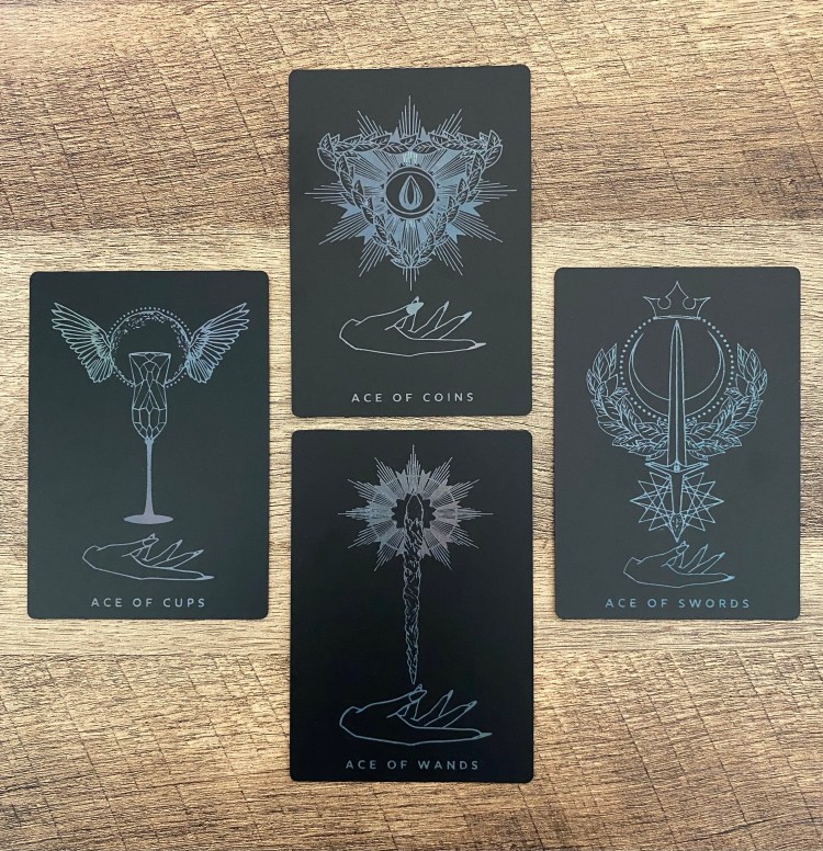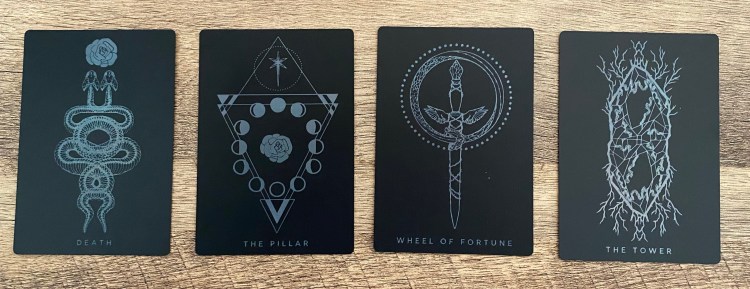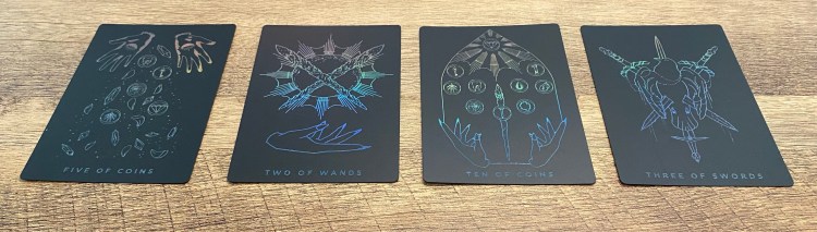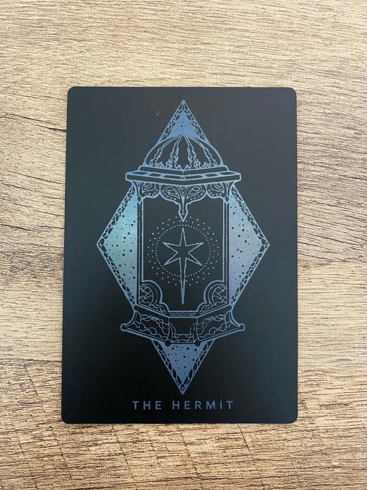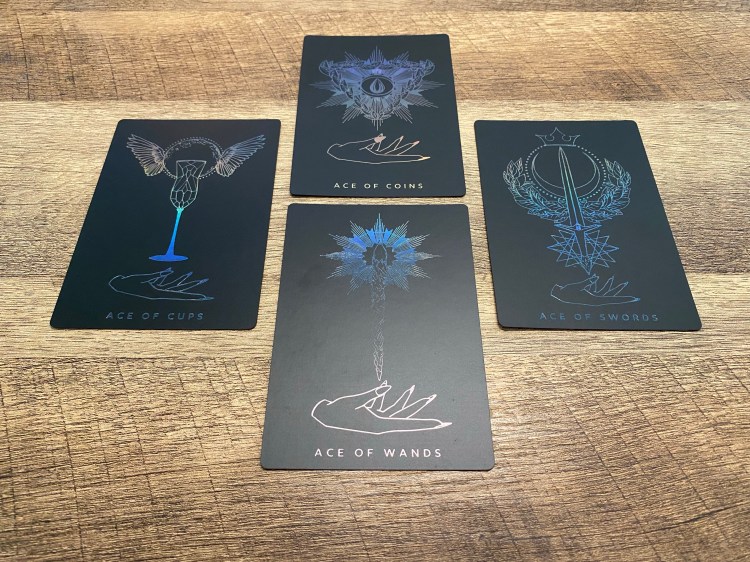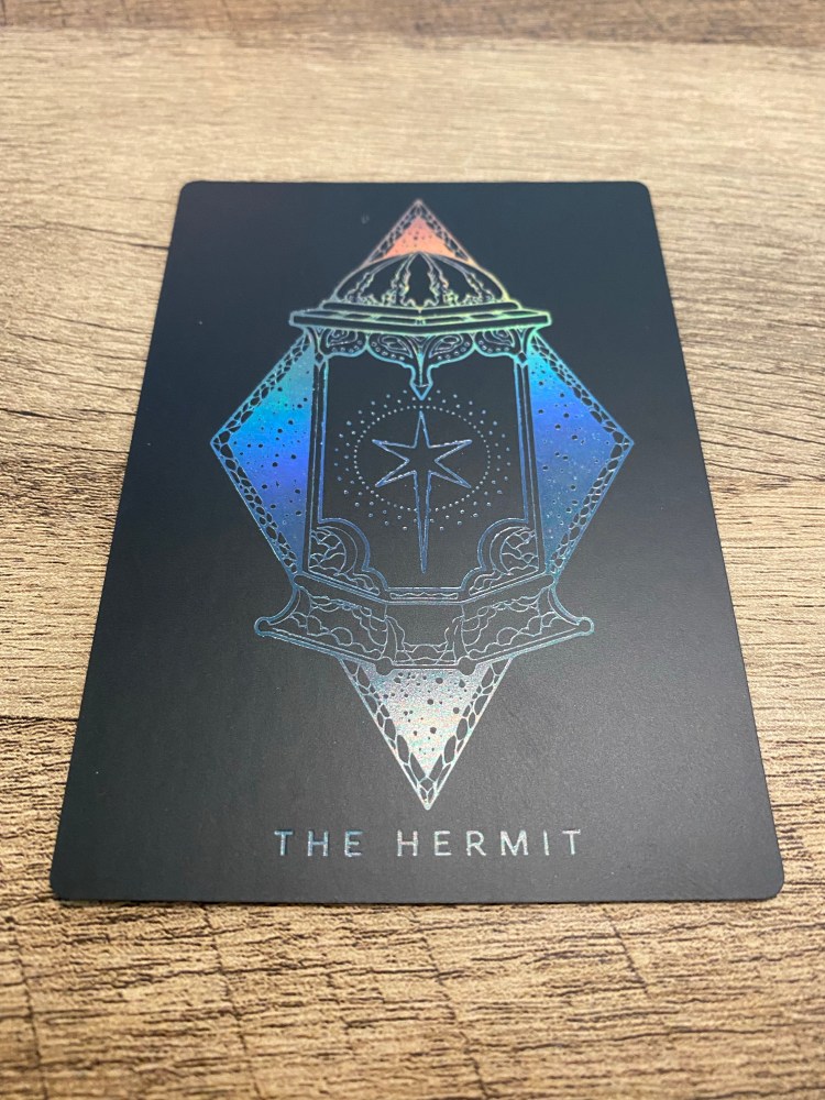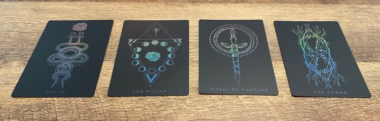 The second flaw, and this is the big one to me, is there was a bit of a misrepresentation on the card design. The photos of the cards online show beautiful holographic foil that changes the colors of the cards based on how it is held, however in real life this is much more muted and honestly, felt a bit cheap. I work in a bright office with plenty of natural light and lamps. Even with the lamps on during the day, the holographic view was muted, most of the time it simply looked like a sad gray color. I eventually took the cards outside in the sun and yes, when in sunlight it is brilliant, however for most people who read indoors, or especially at night, it is actually quite joyless in color and can be hard to actually see the detailing as the foil doesn’t reflect well in low light. While I understand how holographic foiling works and have no qualms there, I am a bit disappointed that the marketed images looked so colorful as I have yet to see that fully reflected in the real deck.
